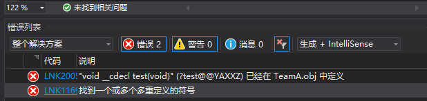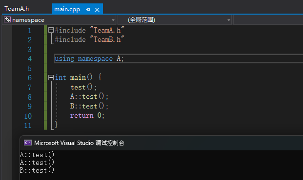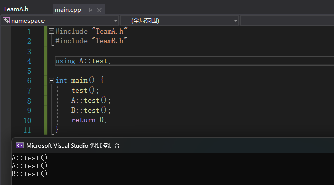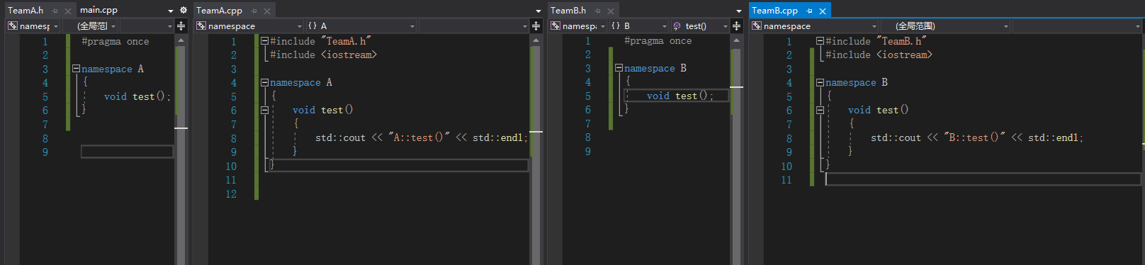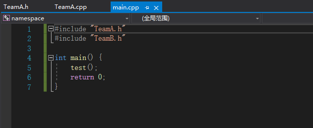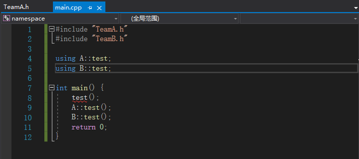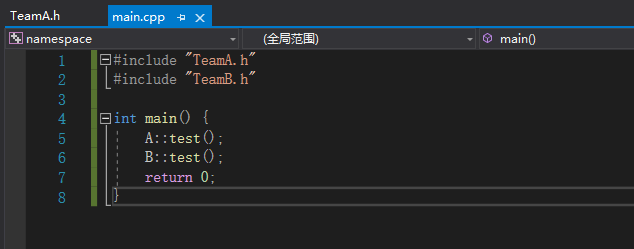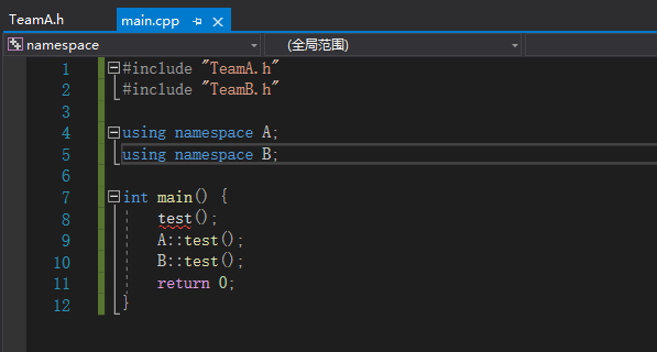 TeamA和TeamB是两个团队,TeamA有代码文件,TeamA.h TeamA.cpp; TeamB有代码文件 TeamB.h TeamB.cpp; 两个团队都定义了test函数,然后main.cpp中引入了这两个团队的头文件,这样在main.cpp中调用test()就会报错。